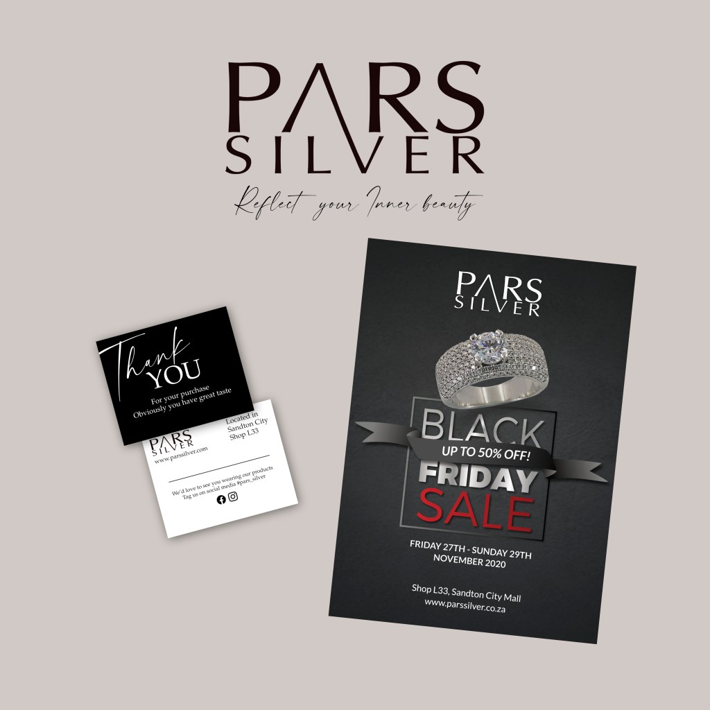 Logo design and promotional material for Pars Silver. A stylish jewelry company specializing in Sterling Silver and gemstones.